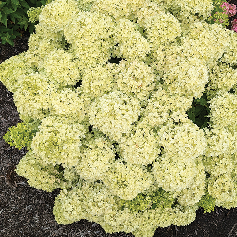 We’ve never seen a hydrangea bloom so much! This petite and sturdy star gives your yard or patio (literally) a full bouquet of creamy lime blooms through summer and fall. Grows to 3′ wide by 3′ tall. Zones 3a–8b.