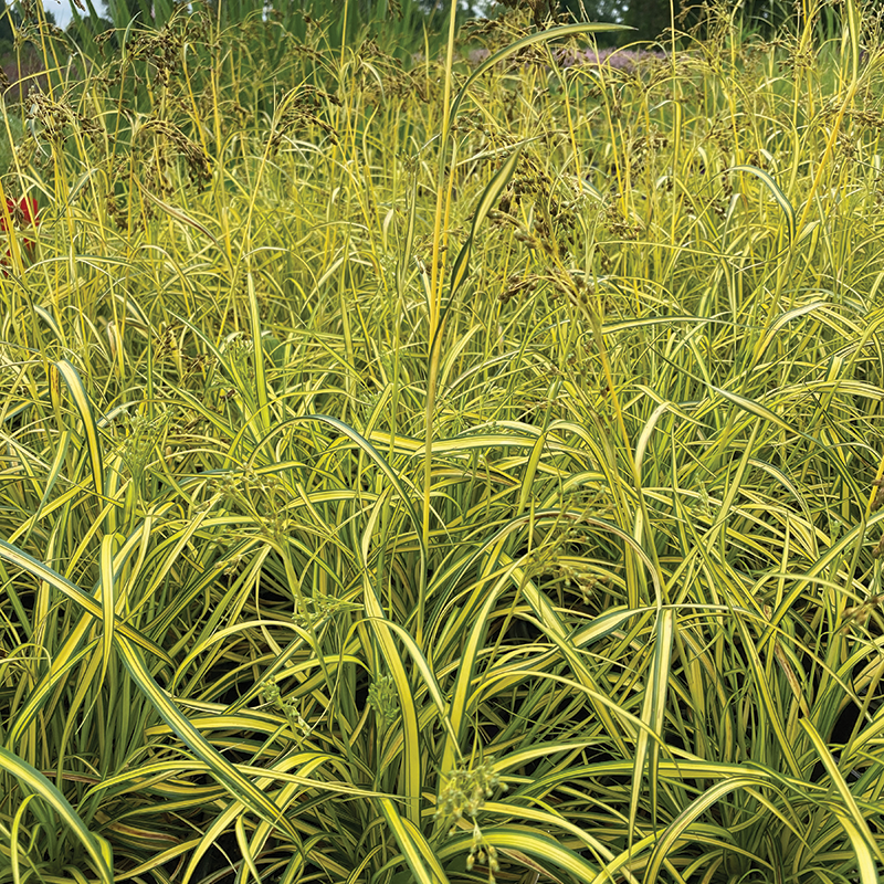 This brightly variegated native bulrush looks very similar to a Carex. Thin strap-like leaves, usually around three-eighths of an inch or one centimeter wide have bright yellow centers with some streaking, both gold and green, within the strong green edges. Leaf length is one foot plus. In July butter yellow stems emerge 18 to 24 inches tall with star-like clusters at the tips. Prefers moist soil and full sun to part shade. Grows to 18-24″ tall. Zones 4a–9b.
